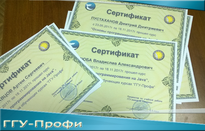Опубликовано Doroshev в Ср, 12/13/2017 - 15:20Закончилась шестимесячная программа по предмету "Основы программирования на Java". Мы подготовили сертификаты для тех, кто дошел до конца. Сертификаты можно получить в ауд.3-15, корп.№4 Обучающие курсы "ГГУ-Профи". Продолжается набор в следующую группу.