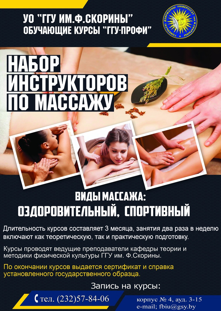 Опубликовано Doroshev в Втр, 12/18/2018 - 12:10Открывается набор в группу инструкторов по массажу. Программа обучения включает теоретическую и практическую подготовку. Практические занятия проводятся в оборудованной для этих целей лаборатории университета. Запись на курсы по телефону (232) 578406.