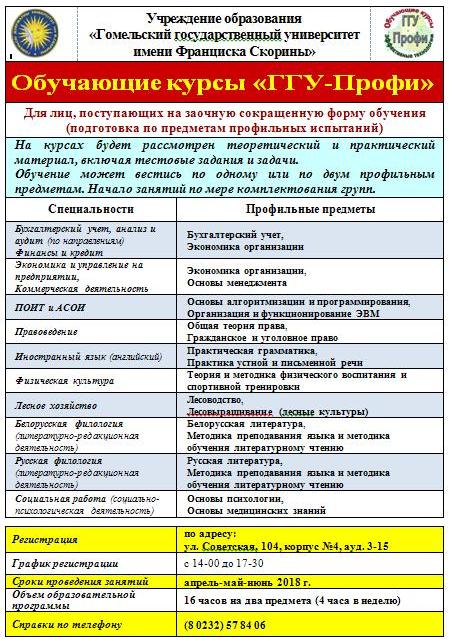 Опубликовано Doroshev в Ср, 06/13/2018 - 13:55Набираются группы желающих пройти экспресс-подготовку для поступления в университет на заочную сокращенную форму обучения. По каждому предмету планируется провести 8 занятий. Запись по тел.(232) 578406 или можно отправить сообщение на fbiu*gsu.by