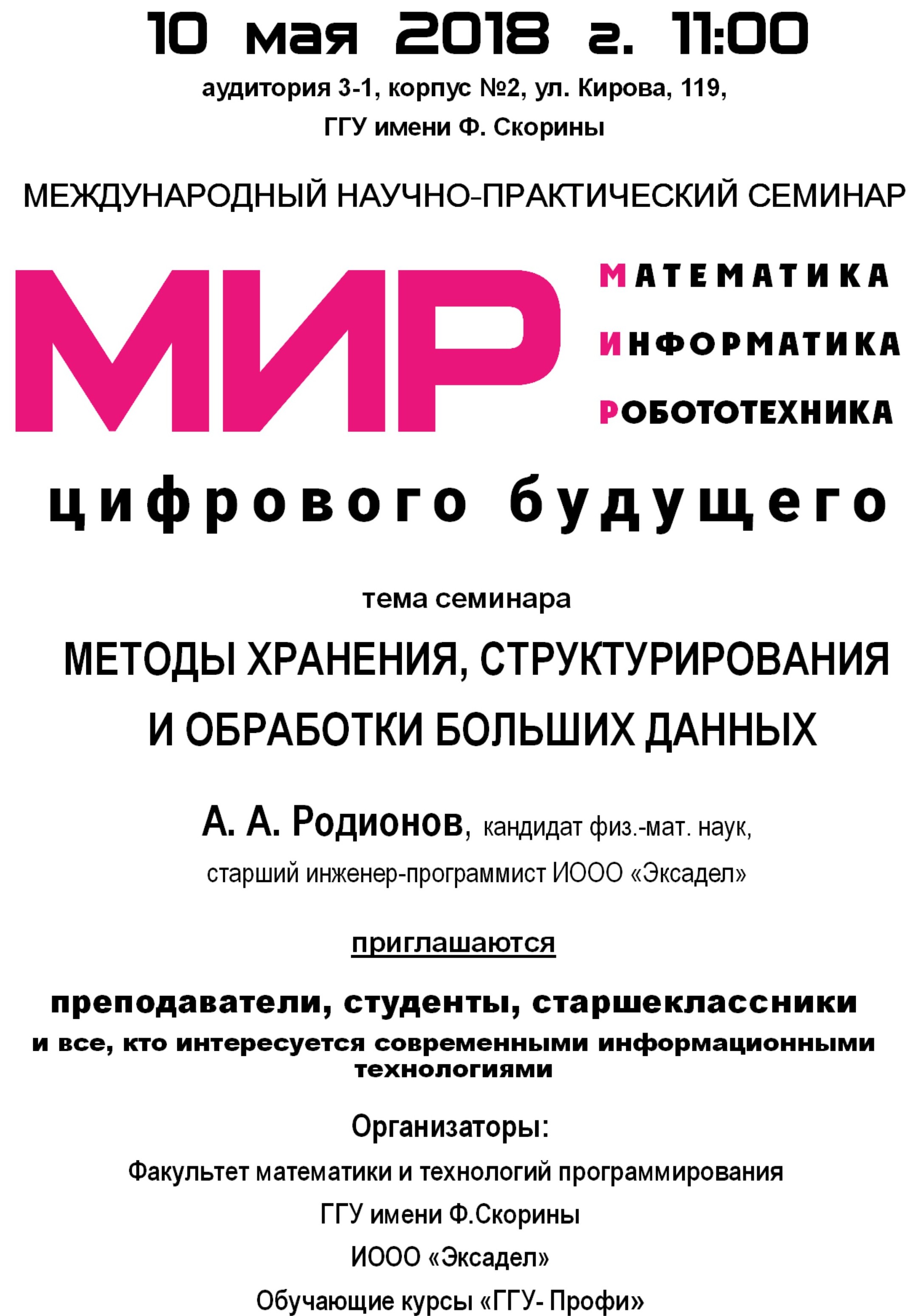 Опубликовано Doroshev в Пнд, 05/07/2018 - 11:31По инициативе факультета математики и технологий программирования, иностранной компании «ЭКСАДЕЛ» и обучающих курсов «ГГУ-Профи» начинает работу междисциплинарный научно-практический семинар «МИР цифрового будущего».