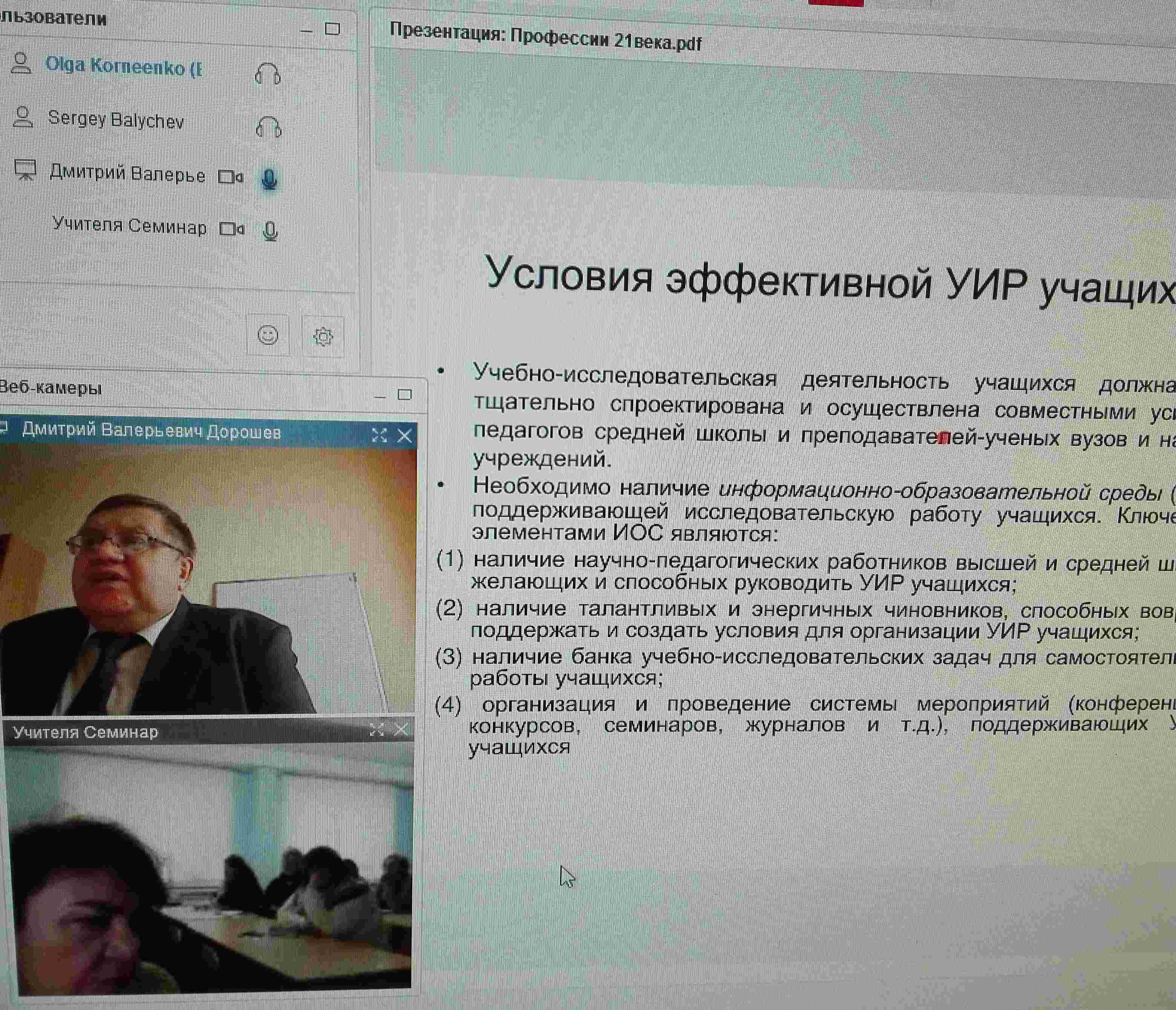 Александр Федорович поделился собственным опытом работы с талантливой молодежью. Основное внимание было уделено аспектам учебно-исследовательской деятельности учащихся по вертикали «школьник-студент» и вопросам тесного взаимодействия в цепочке «школьник-учитель-преподаватель_вуза».