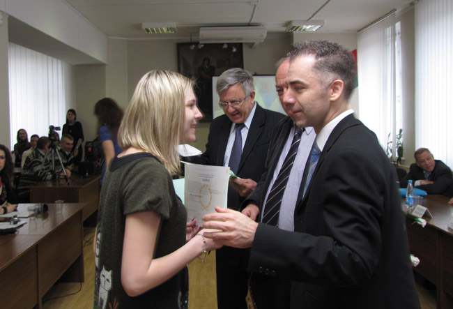 Для вручения молодым специалистам свидетельств о полученном образовании в наш университет прибыла делегация Посольства Республики Франция в Республике Беларусь, в состав которой входили Советник по сотрудничеству и культуре Людовик Руайе, Атташе по сотрудничеству в области французского языка Мишель Максимович, помощник Советника Геннадий Собешкин.
