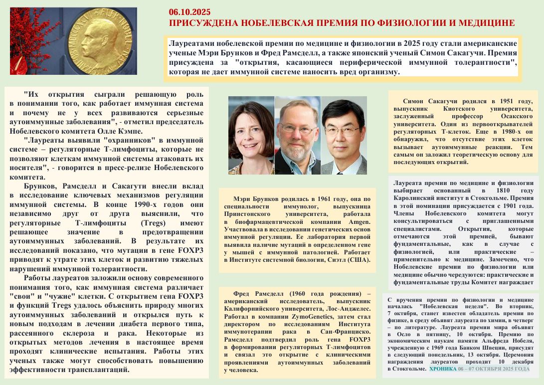 НОБЕЛЕВСКАЯ ПРЕМИЯ – 2025 ПО ФИЗИОЛОГИИ И МЕДИЦИНЕ